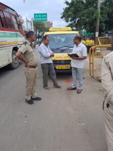 चेकिंग के दौरान चार वाहनों के विरुद्ध चालानी कार्यवाही की गई वहीं एक स्कूल बस को जिसका परमिट नहीं था उसको मंडी समिति चौकी कालुकुंआ में सीज कर दिया गया