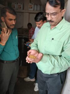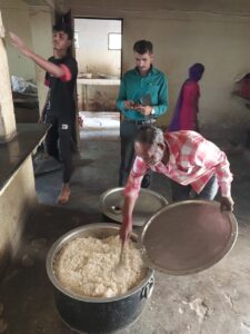 विद्यालय के प्रधानाचार्य श्री कौशल कुमार के साथ आवासीय विद्यालय में रहने वाले बच्चों हेतु तैयार भोजन व भण्डार गृह का निरीक्षण किया गया। मौके पर अरहर दाल, साबुत चना व दलिया का नमूना संकलित कर जांच हेतु भेजा जा रहा है। भोजन तैयार करने वाले रसोईयों का स्वास्थ्य प्रमाण पत्र उपलब्ध कराने तथा रसोईयों को एप्रिन, हेड ग्लब्स एवं हैण्ड ग्लब्स लगाने के साथ-साथ किचेन की साफ-सफाई नियमित रूप से कराये जाने के निर्देश दिये गये। इसी दौरान अध्ययनरत बच्चों को आई०ई०सी० के अन्तर्गत जागरूक किया गया।