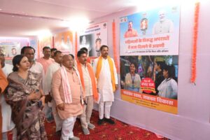 कार्यक्रम समाप्ति के पश्चात उत्तर प्रदेश, राज्य पिछडा वर्ग आयोग के अध्यक्ष मा0 श्री राजेश वर्मा जी ने विभिन्न लाभार्थीपरक योजनाओं से सम्बन्धित लगे स्टालों एवं सूचना एवं जनसंम्पर्क विभाग बाॅदा की शासन से लगी प्रदर्शनी का फीता काटकर शुभारम्भ किया साथ ही प्रदर्शनी का अवलोकन किया। इसके पश्चात प्रेस कान्फ्रेन्स के माध्यम से मीडिया से रूबरू हुए। उन्होंने कार्यक्रम में जनप्रतिनिधियों एवं अधिकारियों के द्वारा गर्भवती महिलाओं को पौष्टिक आहार एवं फलों का वितरण तथा बच्चों का अन्नप्रासन दौरान आईसीडीएस विभाग द्वारा दस आंगनबाडी केन्द्रों को वेट मशीन/ग्रोथ माॅनीटरिंग डिवाइस का वितरण किया गया यथा श्रीमती सुनीता देवी तिन्दवारी, विमला देवी परसौडा, बेला देवी परसौडा-2, राधा पटेल, सविता देवी पल्हरी, किरन निगम बडोखरखुर्द, सोभा देवी तिन्दवारा सहित इत्यादि को प्रदान किया गया। प्रधानमंत्री मातृत्व वन्दन योजना के अन्तर्गत बडोखरखुर्द अक्षिता, दयावती के नाम 5 हजार रूपये का डेमोचेक, श्रीमती अर्चना जौरही 3 हजार रूपये का चेक, महुआ देवांश 5 हजार रूपये का चेक, कृतिका सहित इत्यादि को प्रदान किया गया। साथ ही महिला कल्याण विभाग द्वारा कस्तूरबा विद्यालयों की छात्राओं को सक्षम एवं सामर्थ बनाने के लिए स्पोर्ट किटों का वितरण किया गया, जिसमें सृष्टि शुक्ला, अनुष्का गुप्ता, राखी निगम तथा अटल आवासीय विद्यालय की छात्राओं में शिवानी, प्रेमलता, पिंकी, अनन्या, राजकीय महिला डिग्री काॅलेज की छात्राओं में प्रत्यान्जली, अकांक्षा, संजना को प्रदान की गयी। उन्होंने कोविड काल के दौरान प्रभावित हुए बच्चों को लैपटाॅप वितरण अंजली, आस्था, अंशुमान आदि लाभार्थियों को किया तथा कन्या सुमंगला में लाभार्थियों को चेक वितरित किये। इसके साथ ही निराश्रित महिला पेंशन वितरण एवं पिछडा वर्ग विभाग से ओ-लेवल कम्प्यूटर प्रशिक्षण प्राप्त करने वाले छात्र/छात्राओं को प्रमाण पत्र भी वितरित किये। उन्होंने वन स्टाप सेन्टर को महिला सशक्तिकरण के अन्तर्गत सहायता उपलब्ध कराने हेतु वाहन को हरी झण्डी दिखाकर रवाना किया। उन्होंने विभिन्न विभागों के द्वारा लगाये गये स्टाल तथा पुलिस विभाग द्वारा लगाये गये नये कानूनों की जानकारी एवं प्रदेश में कानून व्यवस्था से सुधार एवं किये गये जनपद स्तर के कार्यों की प्रदर्शनी का भी निरीक्षण किया।